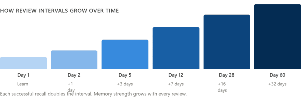 Spaced repetition is a learning technique where you review information at increasing time intervals. You do not study the same thing every day. Instead, you study it, wait a bit, review it again, wait longer, review again, and so on. Each successful recall pushes the next review date further into the future.